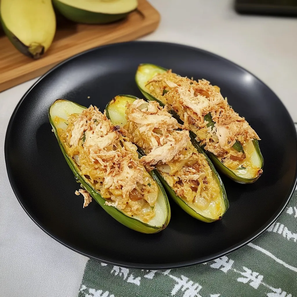 - Distribua as cascas das abobrinhas em uma assadeira e preencha cada metade generosamente com o recheio de frango preparado. É importante compactar levemente o recheio para que fique bem acomodado.